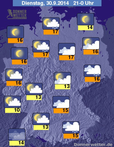 Heute Abend beruhigt sich das Wettergeschehen, die Schauer und Gewitter klingen nach und nach ab und die Bewölkung lockert verbreitet auf. Vor allem im Süden, gebietsweise aber auch im Osten bleiben die Wolken jedoch meist dicht. Es bildet sich stellenweise Nebel oder Dunst. Die Abendtemperatur liegt bei 17 Grad in Hamburg und frischeren 10 Grad am Pfälzer Wald.