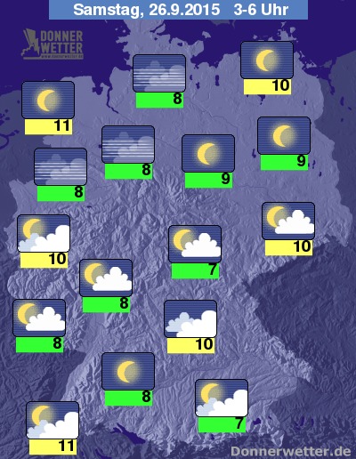 In der Nacht zum Samstag bleibt es über der Nordhälfte Deutschlands verbreitet sternenklar, stellenweise kann sich hier jedoch Nebel oder Hochnebel bilden. Weiter nach Süden hin ist es zumeist locker bewölkt, vor allem im Süden und Südosten aber auch noch oft stark bewölkt, dazu bleibt es jedoch trocken. Die Temperatur sinkt auf 11 Grad im Breisgau und bis 8 Grad in der Lüneburger Heide.