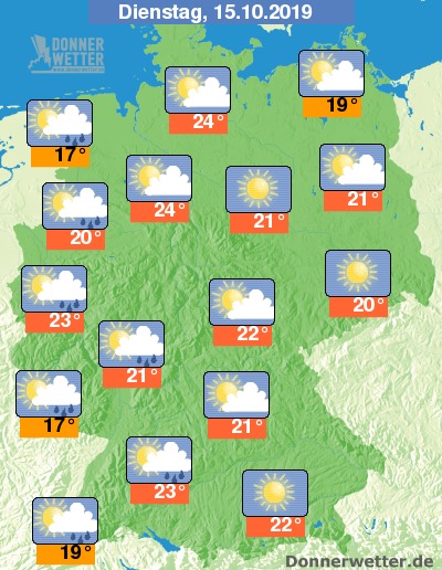 Am Dienstag zeigt sich oft die Sonne hinter zeitweiser lockerer Bewölkung. Einzelne Schauer sind in den westlich gelegenen Bundesländern Deutschlands zu erwarten. Sonst bleibt es trocken. Die Temperaturen erreichen 17 Grad an der Ostseeküste und 24 Grad um den Teutoburger Wald.