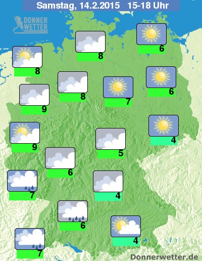 Heute Nachmittag ist es im Nordosten, Osten und im östlichen Bayern weiterhin sonnig und trocken. In den anderen Landesteilen ist es hingegen meist stark bewölkt und Auflockerungen sind eher selten, jedoch bleibt es auch weitgehend trocken, nur nach Südwesten fällt gelegentlich Regen. Die Temperatur liegt bei 4 Grad entlang der Donau und um 9 Grad in Köln.