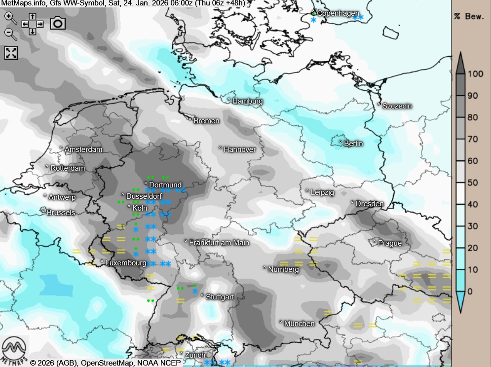 Ansonsten zeigt sich der Himmel über dem Norden und Osten hochnebelartig bedeckt oder es ist stark bewölkt. Sonst ist es heiter, vor allem im südlichen Bayern und Baden-Württemberg auch sonnig. Vom Westen bis in die Mitte nimmt die Bewölkung am Samstag zu, dabei fällt zeitweise etwas Regen oder Schnee. Lokal besteht Glättegefahr!
