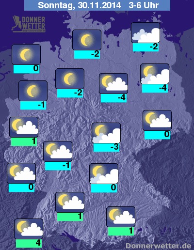 In der folgenden Nacht bleibt es überwiegend bei lockerer Bewölkung, vor allem im Süden, aber auch in der Mitte und im Nordosten des Landes können die Wolken aber auch zeitweise dicht sein, dazu bleibt es aber trocken. Nach Nordwesten hin ist der Himmel dagegen weitgehend sternenklar. Es bildet sich stellenweise Nebel oder Hochnebel. Die Temperatur sinkt bis zum Morgen auf 4 Grad in Konstanz und rund -4 Grad in Brandenburg.