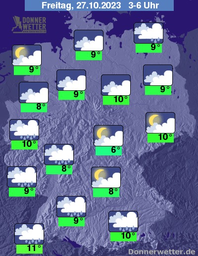 In der Nacht zum Freitag zieht von Südwesten her ein neues Regenband auf, das im Nachtverlauf etwa die Südwesthälfte Deutschlands umfasst. Im Norden und Osten ist es weitgehend dicht bewölkt, aber auch größtenteils trocken. Die Temperatur sinkt auf 11 Grad in Freiburg und 6 Grad in Jena.