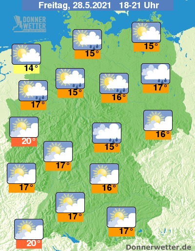 Heute Abend sind im Norden und Osten noch letzte Schauer, selten auch Gewitter möglich, dazwischen zeigen sich aber auch häufig heitere bis sonnige Abschnitte. Im übrigen Bundesgebiet ist es meist aufgelockert, teils auch stark bewölkt und dazu weitgehend trocken. Die Temperatur liegt bei 14 Grad in Cuxhaven und bis 20 Grad in Freiburg.