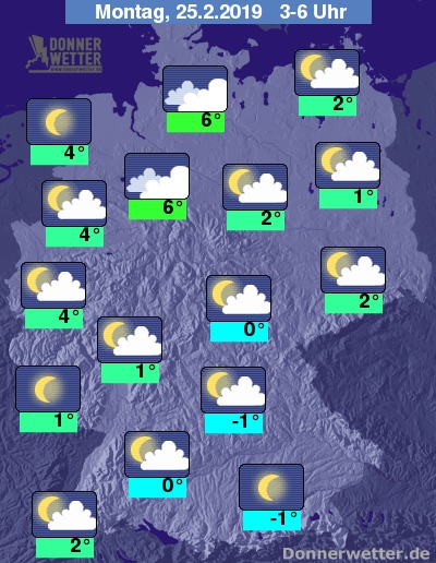 In der Nacht zum Montag ist es zunächst überwiegend sternenklar, von Norden verdichten sich die Wolken allerdings zunehmend und vor allem in der zweiten Nachthälfte ist es über der Nordhälfte oft auch stark, teils noch aufgelockert bewölkt. Weiter nach Süden hin zeigt sich der Himmel hingegen weiterhin locker bewölkt oder sternenklar. Es bleibt landesweit trocken bei Tiefstwerten von 6 Grad in Hamburg und bis -1 Grad in Rosenheim.