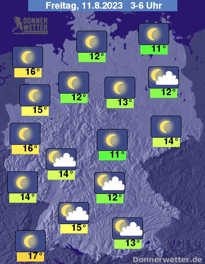 In der Nacht zum Freitag ist der Himmel überwiegend sternenklar, hier und da können ein paar wenige Wolken durchziehen. Es bleibt landesweit trocken bei Tiefstwerten von 17 Grad im Breisgau und 11 Grad in Vorpommern.