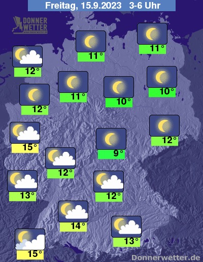 In der Nacht zum Freitag ist der Himmel verbreitet sternenklar. Im Süden und Westen zieht aber oft leichte bis wechselnde Bewölkung durch. Bei Tiefstwerten von 15 Grad im Oberrheingraben und 9 Grad im Grabfeld bleibt es überall trocken.