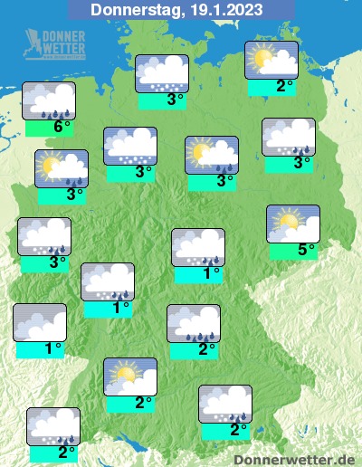 Am Donnerstag ist es oft stark bis dicht bewölkt. Hier und da zeigen sich jedoch auch mal heitere Abschnitte. Es fällt örtlich Regen, Schneeregen, Schnee oder Graupel. Die Temperatur erreicht 1 Grad im Eichsfeld und bis zu 6 Grad an der Nordsee. An den Küsten herrscht zum Teil Sturm.
