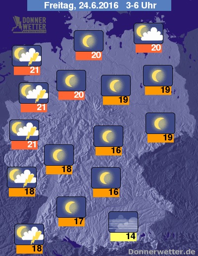 In der folgenden Nacht ziehen westlich des Rheins und an der Nordsee hier und da dichtere Quellwolken durch, die für vereinzelte Schauer und Gewitter sorgen können. Sonst ist es hier aber auch oft nur locker bewölkt oder klar. Im übrigen Land ist es verbreitet nur sternenklar und dabei auch trocken. Die Temperatur sinkt auf schwülwarme 21 Grad an der Ems und bis auf 14 Grad in Augsburg.