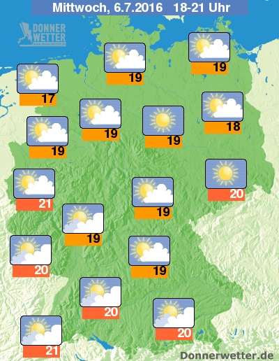 Ruhiges und trockenes Hochdruckwetter begleitet uns dann auch während der Partie Portugal - Wales. Meist ist der Himmel locker bewölkt, im Erzgebirge sowie am Niederrhein zeigt sich der Himmel auch klar.