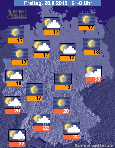 Heute Abend können sich im Südwesten Deutschlands noch einzelne Schauer bilden. Über dem Alpenvorland und Sachsen ziehen auch teils einige Wolken durch, die jedoch kaum Regen bringen. Im übrigen Land zeigt sich der Himmel hingegen bereits häufig sternenklar oder es ziehen nur lockere Wolkenfelder übers Land, dazu bleibt es trocken. Die Abendtemperatur liegt bei warmen 22 Grad im Oberrheingraben und etwa 16 Grad im Eichsfeld.