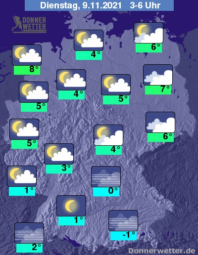 In der kommenden Nacht ist der Himmel über Süddeutschland meist sternenklar, weiter nach Norden hin ist es größtenteils locker bis aufgelockert bewölkt. Besonders vom Osten bis in den Nordosten des Landes halten sich meist dichte Wolken. Es bleibt überall trocken bei Tiefstwerten von 8 Grad in Wilhelmshaven und bis -1 Grad im Raum München.