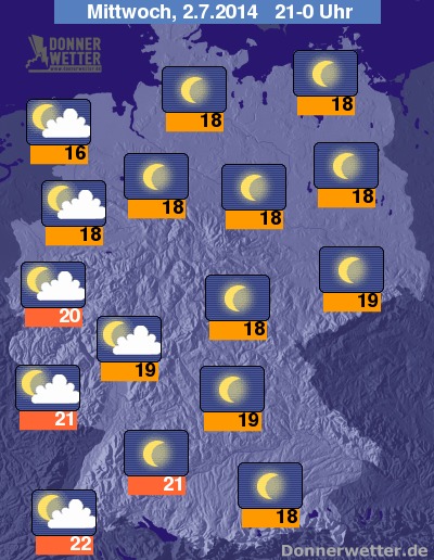 Heute Abend klingen auch die Schauer in Vorpommern und im Voralpenland meist rasch ab, so dass es hier, sowie schon im übrigen Deutschland trocken bleibt. So zeigt sich verbreitet ein klarer Sternenhimmel. Von Westen her ziehen nur ein paar lockere Wolkenfelder herein. Die Abendwerte liegen bei teils noch 22 Grad in Freiburg und etwa 16 Grad in Meppen.