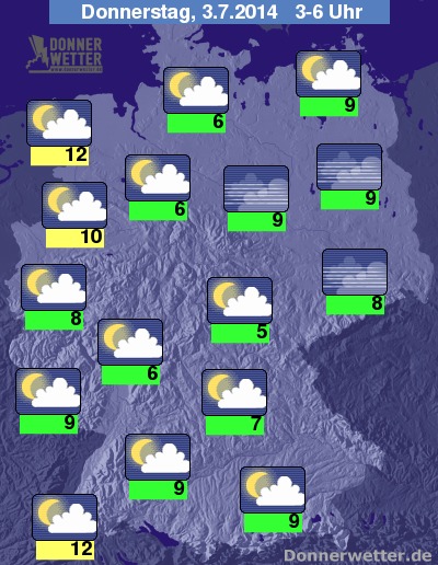 In der Nacht zum Donnerstag ziehen von Westen her nur lockere Wolkenfelder durch. Häufig ist es auch klar und es bleibt trocken. Die Temperaturen sinken auf 12 Grad in Ostfreisland und etwa 5 Grad im Vogtland.