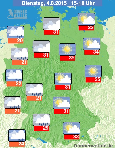 Heute Nachmittag ist es in der Osthälfte des Landes anfangs noch verbreitet heiter bis sonnig und dazu trocken, während im Westen bereits meist dichte Wolken mit zum Teil kräftigem und gewittrigem Regen durchziehen. Zum späten Nachmittag sind auch in den östlicheren Landesteilen teils schwere Gewitter möglich. Die Temperatur liegt bei 20 Grad im nördlichen Emsland und bei bis zu 35 Grad in Leipzig.