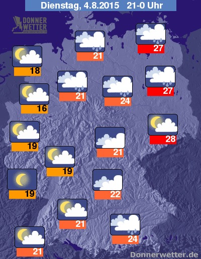 Heute Abend ziehen über den Norden und praktisch über die gesamte Osthälfte von Deutschland weitgehend dichte Wolken und es können sich verbreitet Schauer und teils schwere Gewitter entwickeln. Von Westen und Südwesten her lockert die Bewölkung hingegen immer weiter auf und es bleibt trocken, im weiteren Verlauf wird es auch häufig sternenklar. Die Abendtemperatur liegt bei sehr warmen 28 Grad in Dresden und etwa 16 Grad im Münsterland.