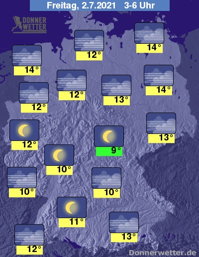 In der kommenden Nacht ist es gebietsweise dunstig-trüb oder stärker bewölkt, vor allem über der Südhälfte zeigt sich der Himmel zum Großteil auch sternenklar. Es bleibt weitgehend trocken bei Tiefstwerten von 14 Grad im nördlichen Emsland und bis 9 Grad im Grabfeld.