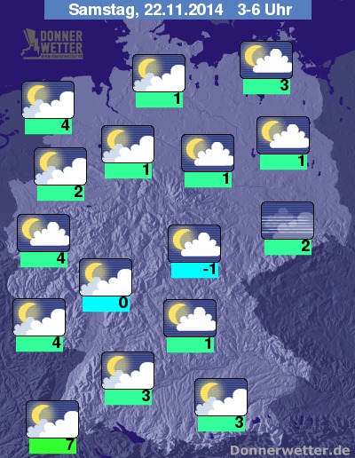 In der Nacht zum Samstag bleibt es bei der lockeren bis aufgelockerten Bewölkung, dabei bleibt es überall trocken. Besonders im Süden und Osten kann sich stellenweise Nebel oder Hochnebel bilden. Die Tiefstwerte liegen bei 7 Grad in Freiburg und etwa -1 Grad im Thüringer Becken.