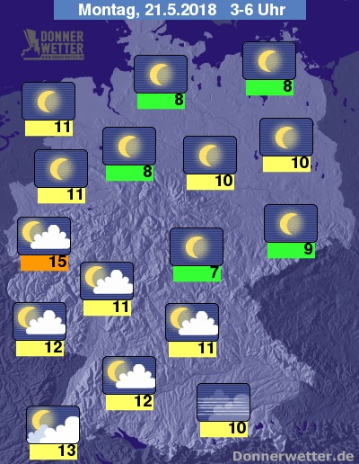 In der Nacht zum Montag klingen letzte Schauer und selten Gewitter im Süden rasch ab und die Bewölkung lockert spätestens im Laufe der zweiten Nachthälfte auf. Über der Nordhälfte der Republik bleibt es über die Nacht sternenklar, im Westen sind hier und da lockere Wolken möglich, dazu bleibt es trocken. Die Temperatur sinkt auf 15 Grad in Köln und bis 7 Grad im Grabfeld.