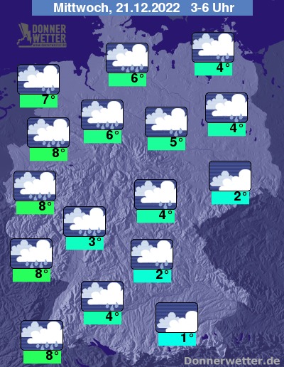 In der Nacht zum Mittwoch ist der Himmel verbreitet dicht bewölkt und es fällt zeitweise, teils auch länger anhaltender Regen. Die Temperatur sinkt auf 8 Grad entlang des Rheins und bis 1 Grad im Berchtesgadener Land.