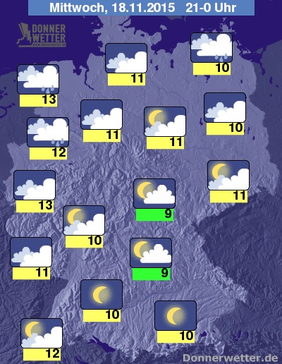 Heute Nachmittag ist es über der Südhälfte des Landes teils stark, teils aber auch aufgelockert bewölkt und es bleibt überwiegend trocken. Vor allem im Süden ist es auch zum Teil heiter. In den anderen Landesteilen hält sich hingegen meist dichte Bewölkung, dazu bleibt es aber ebenfalls weitgehend trocken. Gegen Abend zieht von der Nordsee her jedoch neuer Regen auf. Die Temperatur liegt bei 10 Grad an der Elbe und etwa 14 Grad am Bodensee. Es weht teils frischer bis starker Wind. In Nordseenähe nimmt der Wind zum Abend deutlich zu und an der Nordsee sind dann orkanartige Böen möglich.