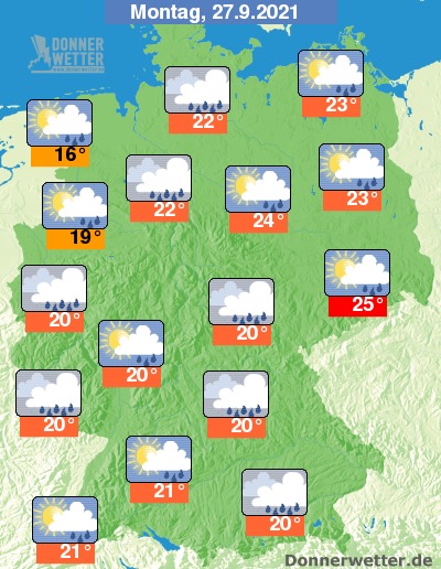 Am Montag ziehen oft viele und gebietsweise dichte Wolken durch, jedoch sind auch Auflockerungen möglich. Es bilden sich zeitweise Schauer, selten können sich auch Gewitter entwickeln. Die Temperatur steigt auf 16 Grad in Cuxhaven und bis 25 Grad in Dresden.