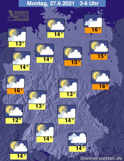 In der Nacht zum Montag bilden sich vor allem im Süden anfangs noch vielerorts Schauer, hier und über der übrigen Südwesthälfte des Landes bleibt es die Nacht durch auch größtenteils stark bewölkt, jedoch kann es auch zeitweise etwas auflockern. Über dem Norden und Osten des Landes ist es ebenfalls teils stark, oft jedoch auch nur locker bewölkt, dazu bleibt es weitgehend trocken. Die Temperatur sinkt auf recht milde 16 Grad in Rostock und bis 12 Grad in Saarbrücken.