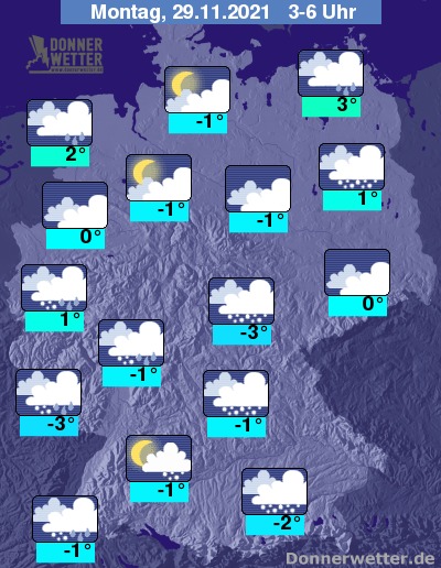 In der Nacht zum Montag ist es im Norden stark, teils auch aufgelockert bewölkt und meist trocken. Im übrigen Land bringen kompakte Wolken vielerorts Schnee oder Schneeregen. Nur selten lockert es zwischendurch auch mal etwas auf. Oft ist es neblig-trüb bei Tiefstwerten von 3 Grad auf Rügen und bis -3 Grad am Pfälzer Wald.