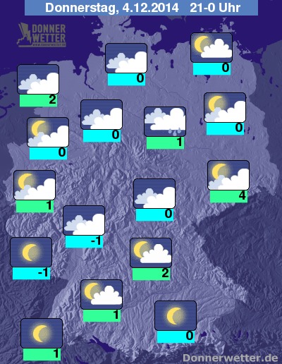 In der kommenden Nacht fällt in Norddeutschland unter überwiegend dichten Wolken noch hier und da etwas Regen, sonst ist es häufig neblig trüb oder bedeckt, zeitweise kann die Bewölkung aber auch mal etwas auflockern. Es bleibt trocken. Stellenweise bildet sich jedoch Nebel oder Hochnebel. Die Temperatur sinkt auf 4 Grad in Dresden und bis -2 Grad im Taunus.