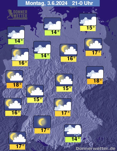 Am Montagnachmittag sind im Süden und Südosten immer wieder Schauer möglich, auch lokale Gewitter können nicht ausgeschlossen werden. In den übrigen Landesteilen ist der Himmel am Nachmittag verbreitet wolkig und es bleibt meist niederschlagsfrei.