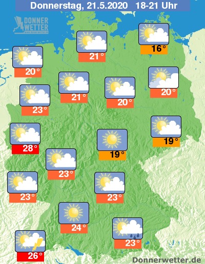 Die Temperaturen liegen am frühen Abend im Norden und Nordosten bei 15 bis 22 Grad, im Süden und Westen bei frühsommerlichen 23 bis 28 Grad.