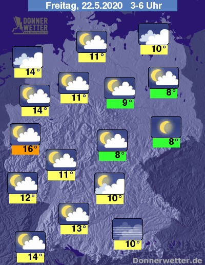 Bis zu den Frühstunden kühlt die Luft auf 10 bis 14 Grad ab, in den größeren Städten im Westen wird es kaum kühler als 16 Grad, in Mittelgebirgstälern, sowie im Osten sinken die Werte meist in den einstelligen Bereich.