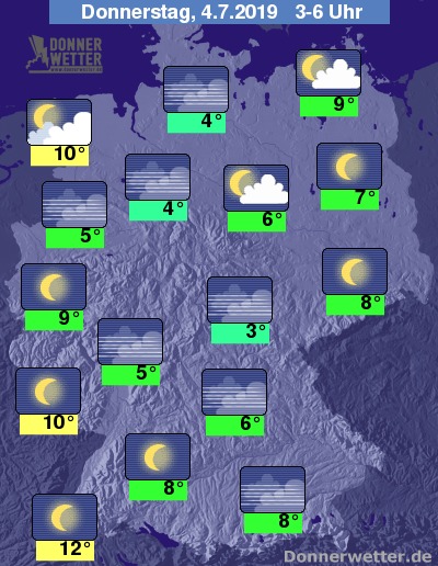 Während der zweiten Nachthälfte bleibt es verbreitet sternenklar oder nur leicht bewölkt. Stellenweise bilden sich in der stark abkühlenden Luftmasse Nebelfelder.