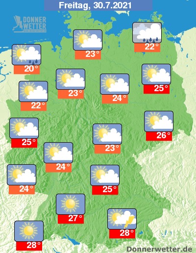 Am Freitag zeigt sich das Wetter im Norden oft stark, teilweise auch aufgelockert bewölkt, dabei bilden sich gebietsweise Schauer. Im übrigen Land ist es hingegen meist heiter, teils ist es wechselnd bewölkt, dabei bleibt es weitgehend trocken. Die Temperatur erreicht 20 Grad im nördlichen Emsland und bis 28 Grad im Oberrheingraben.