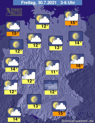 In der bevorstehenden Nacht bilden sich über Oberbayern bis weit nach Mitternacht weitere, teils gewittrige Schauer. Einzelne Schauer sind auch im Nordseeumfeld möglich. Im übrigen Bundesgebiet ist der Himmel dagegen zumeist locker bewölkt oder sternenklar. Zum Teil ist es auch aufgelockert bewölkt, dazu bleibt es trocken. Die Temperatur sinkt auf 16 Grad in der Lausitz und bis 11 Grad im Eichsfeld.