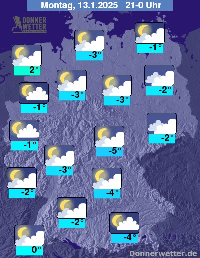 In der Nacht zum Dienstag zeigt sich der Himmel über dem Norden oft stark bewölkt und es kann etwas Regen fallen, teils auch gefrierend. Vorsicht, Glättegefahr! In den übrigen Landesteilen ist es wolkig oder gering bewölkt, im Süden auch sternenklar, und es bleibt trocken. Gebietsweise kann sich Nebel bilden.