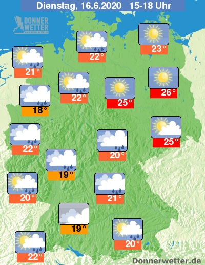 Am frühen Nachmittag gibt es nordöstlich der Mittelgebirge, sowie in Schleswig-Holstein eine freundliche Mischung aus Sonne und Wolken, im Ostseeumfeld strahlt die Sonne auch für längere Zeit. In den anderen Gebieten bleibt es abgesehen örtlicher Auflockerungen stärker bewölkt und es fällt zeit- und gebietsweise Regen, oder es gehen örtliche Schauer und einzelne Gewitter nieder, die zum Teil recht kräftig ausfallen können.