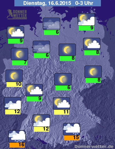 Die Temperaturen fallen auf 15 Grad C am Oberrhein und kühle 4 Grad C im Thüringer Wald.