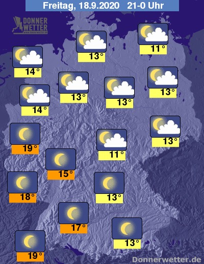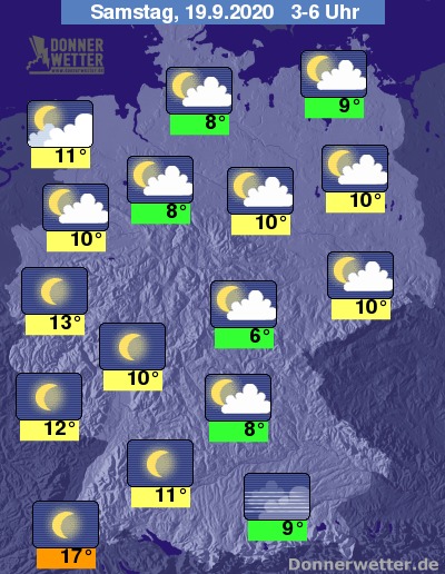 Bis zu den Frühstunden kühlt die Luft auf 5 bis 14 Grad ab, ganz im Südwesten bleibt es mit Werten von über 15 Grad ausgesprochen mild. In einigen geschützten Mittelgebirgstälern kann es jedoch stellenweise leichten Bodenfrost geben.