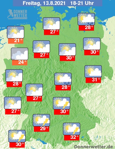 Heute Abend ist es zumeist locker oder aufgelockert, hier und da auch stark bewölkt, dabei bilden sich nur noch selten, am ehesten noch im Süden Deutschlands vereinzelt Schauer oder Gewitter. Die Temperatur liegt bei 21 Grad in Emden und bis 32 Grad in München.