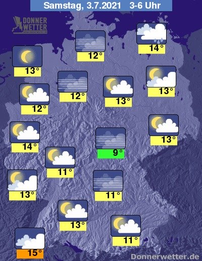 In der Nacht zum Samstag bringen dichte Wolken im Ostseeumfeld gebietsweise Regen. Im übrigen Bundesgebiet ist es zumeist locker bis wechselnd bewölkt und vor allem in einem breiten Streifen von Nordwest bis nach Süddeutschland verbreitet auch sternenklar, dazu bleibt es trocken. Die Temperatur sinkt auf 15 Grad in Freiburg und bis 9 Grad in Jena.