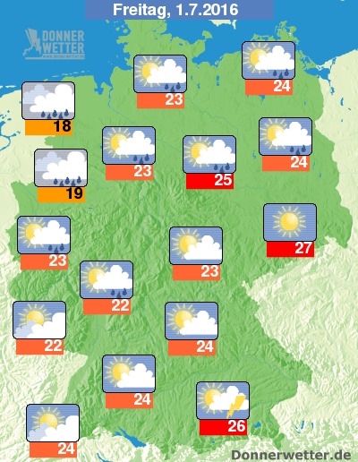 Die Temperaturen erreichen Werte um 18 Grad C in Ostfriesland und um 27 Grad C in Dresden.