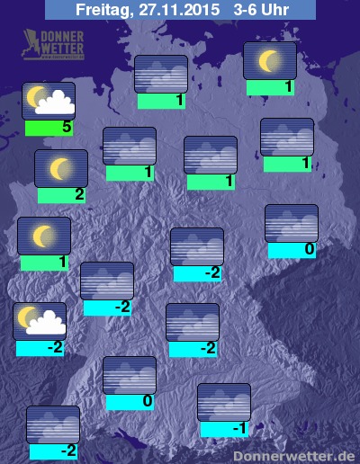 In der kommenden Nacht ist es im Süden noch teils stark bewölkt, jedoch weitgehend trocken, sonst zeigt sich der Nachthimmel verbreitet sternenklar, hier und da können auch lockere Wolken durchziehen, dabei bleibt es trocken. Die Temperatur sinkt auf 5 Grad in Emden und bis -2 Grad in Franken. Es bildet sich gebietsweise Nebel oder Hochnebel. Dabei kann es glatt auf den Straßen werden!