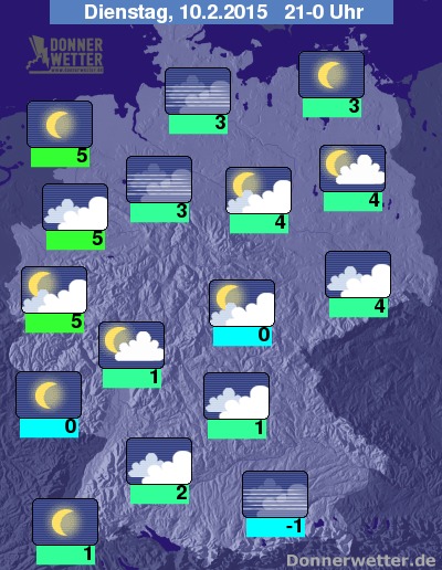In der Nacht zum Mittwoch ist es im Norden des Landes teils sternenklar, teils jedoch auch neblig-trüb, weiter nach Süden ist es oft aufgelockert bewölkt, gebietsweise kann es aber auch hier neblig-trüb sein. Es bleibt weitgehend trocken. Die Temperatur sinkt auf 3 Grad an der Nordsee und etwa -3 Grad in München.
