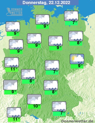 Am Donnerstag ziehen weitgehend dichte Wolken übers Land hinweg, dabei fällt zeitweise Regen. Die Temperatur steigt auf 7 Grad an der Müritz und bis 11 Grad entlang des Rheins. An den Küsten weht ein zum Teil stürmischer Wind.