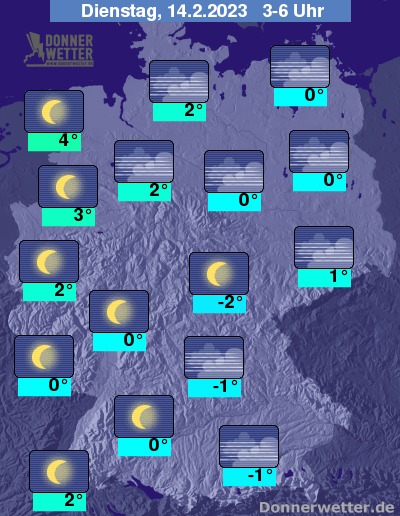 In der Nacht zum Dienstag zeigt sich der Himmel über der Republik verbreitet sternenklar, stellenweise ist Nebel möglich. Es bleibt landesweit trocken bei Tiefstwerten von 4 Grad in Wilhelmshaven und -2 Grad im Grabfeld.