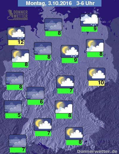 In der Nacht zum Montag ziehen insbesondere im Umfeld von Nord- und Ostsee oft dichte Wolken hinweg, dabei können sich Schauer und auch vereinzelte Gewitter bilden. Oft aufgelockert bis stark bewölkt bei gebietsweise etwas Regen ist es vom Osten bis in den Südosten der Republik. Im übrigen Bundesgebiet zeigt sich der Himmel dagegen meist locker bewölkt oder sternenklar, dazu bleibt es weitgehend trocken. Stellenweise bildet sich Nebel oder Hochnebel. Die Temperatur sinkt auf 12 Grad an der Nordseeküste und bis 5 Grad am Pfälzer Wald.