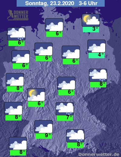 In der Nacht zum Sonntag bleibt die Wolkendecke praktisch überall durchweg verschlossen und es fällt auch hier und da und vor allem zum Morgen hin zeitweise Regen. Die Temperatur sinkt auf 9 Grad in Stuttgart und bis 3 Grad auf Rügen. Im Küstenumfeld weht weiterhin starker bis stürmischer Wind.