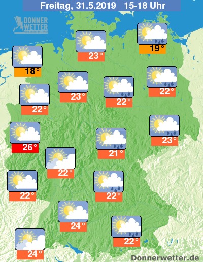 Am Nachmittag fallen im Norden und Osten aus dichteren Wolken gebietsweise Regengüsse, vereinzelt auch in Verbindung mit Blitz und Donner. Im Süden und Westen gibt es größere Aufheiterungen und es bleibt meistens trocken.