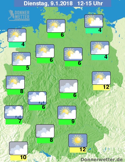 Heute Nachmittag ziehen über den Südwesten und Westen dichte Wolken, die hier gebietsweise auch Regen bringen, sonst ist es vor allem im Südosten oft heiter bis sonnig, im übrigen Bundesgebiet locker bis aufgelockert bewölkt und dabei trocken. Die Temperatur liegt bei 4 bis 12 Grad.
